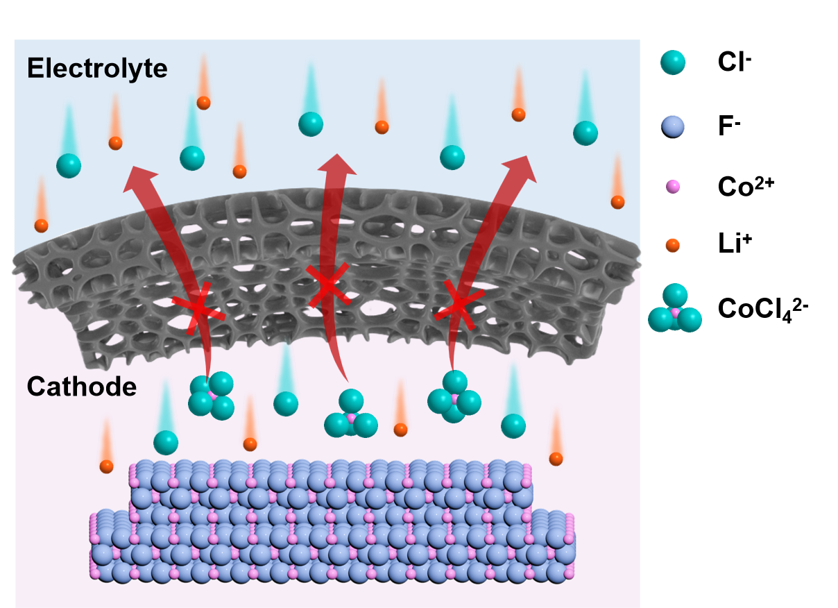 To explain this performance breakthrough, the researchers identified a “size-sieving confinement mechanism.” Thermodynamic analysis and experimental validation revealed that CoF2 undergoes anion exchange with LiCl in the electrolyte to form CoCl42- complexes, which are primarily responsible for active material migration. The tailored sub-nanometer channels effectively block the diffusion of the larger CoCl42- complexes while allowing the rapid transport of smaller Li+ ions, thereby significantly suppressing the shuttle effect.